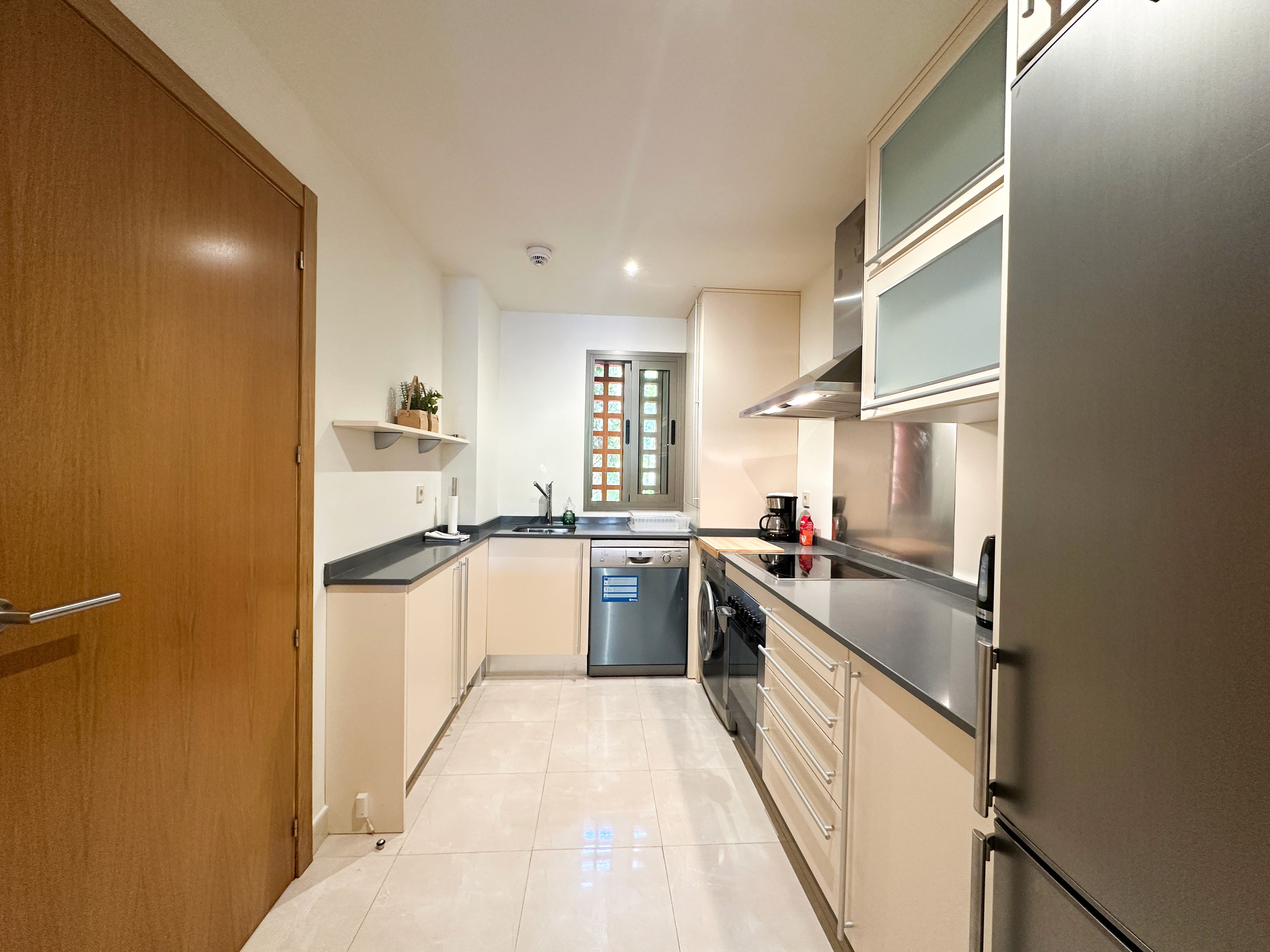 Kuchnia w pełni wyposażona: płyta, piekarnik, zmywarka, duża lodówka – gotuj swobodnie jak w domu.